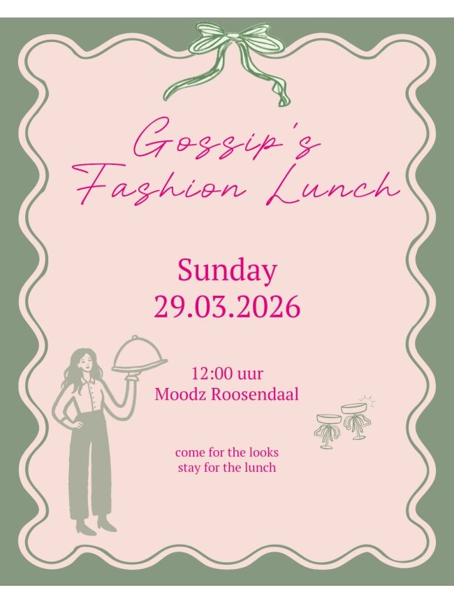De Gossip Fashion Lunch is here! Geniet van een fantastische middag vol met fashion inspiratie & heerlijke lunch. Dit jaar is de fashion lunch bij Moodz in Roosendaal. Tijdens de lunch zal je de mooiste looks voorbij zien komen, onder het genot van een gerecht naar keuze. Na de show is het natuurlijk tijd om te shoppen & krijg je ook exclusieve toegang om de nieuwste items als eerste te shoppen. Op vertoon van jouw ticket krijg je €5,- korting op jouw aankoop!