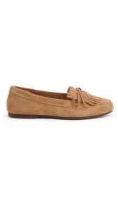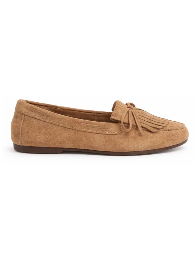 Deze stijlvolle suède look moccasins zijn een perfecte mix van comfort en stijl. De schoentjes zijn uitgevoerd in een zachte beige kleur en afgewerkt met klassieke franjes en een decoratief strikdetail op de wreef. Dankzij het tijdloze design zijn ze eindeloos te combineren, van casual tot chic. Een echte essential voor het voorjaar en najaar.