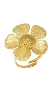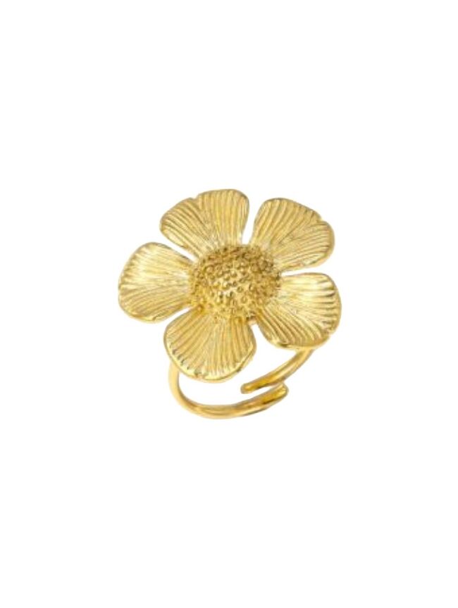 Deze goudkleurige ring in bloemvorm geeft je outfit een speelse en frisse uitstraling. Het open design zorgt ervoor dat de ring makkelijk verstelbaar is. Leuk om te dragen als subtiele eyecatcher.