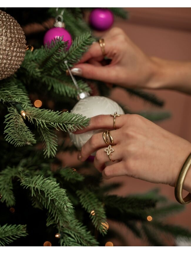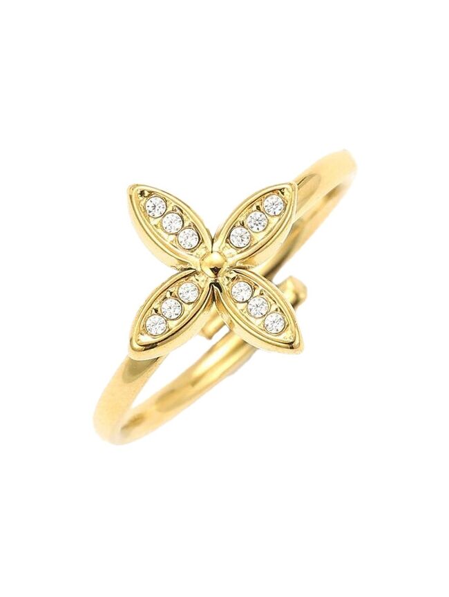 De ring klaver strass small is een elegante ring met een subtiele klaver ingelegd met sprankelende strass steentjes. Het verfijnde ontwerp straalt klasse en geluk uit in één. Perfect om dagelijks te dragen of te combineren met andere ringen voor een chique, gelaagde look.