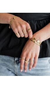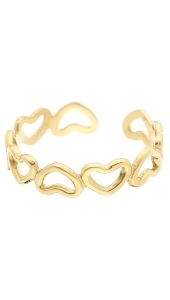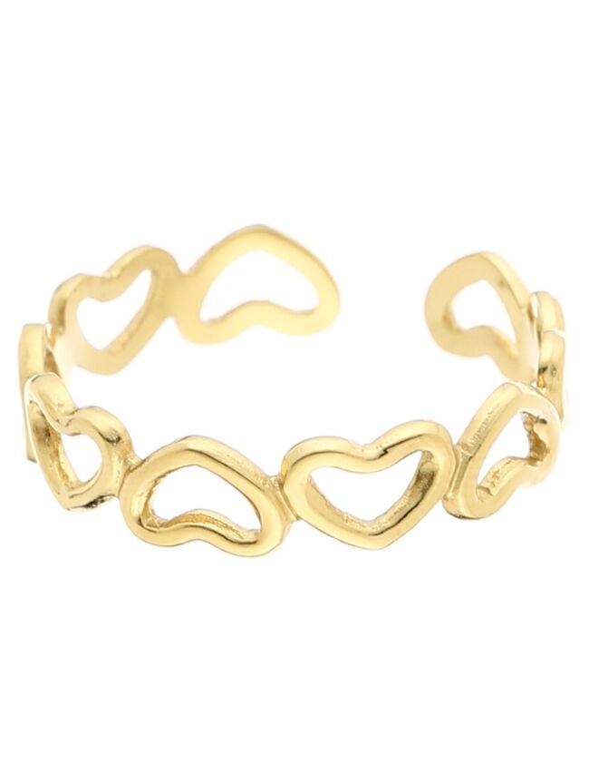 Vier de liefde met deze prachtige gouden ring van roestvrij staal, ontworpen met sierlijke hartjes die symbool staan voor verbondenheid en warmte. Of het nu een betekenisvol cadeau is of een elegante toevoeging aan je eigen sieradencollectie, deze ring straalt pure romantiek uit.