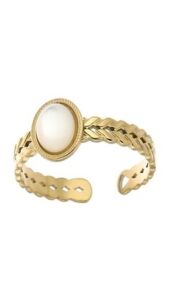 Deze prachtige ring heeft een elegante vintage uitstraling dankzij het verfijnde gevlochten design en de ovale witte steen. De zachte, melkachtige glans van de steen combineert prachtig met de goudkleurige afwerking en geeft de ring een tijdloze, klassieke charme.
