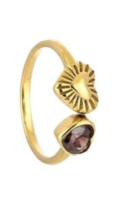 Deze goudkleurige ring met dubbele hartvorm combineert een subtiel reliëf met een bruin steentje. Een minimalistisch design met een zachte, elegante uitstraling.
