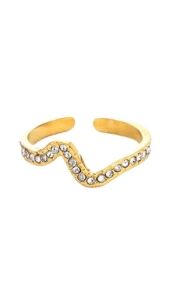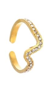 Deze goudkleurige open ring heeft een speels, golvend design en is afgewerkt met fonkelende steentjes. Het verfijnde model geeft een luxe uitstraling en zit comfortabel dankzij de licht verstelbare pasvorm. Perfect voor een subtiele, maar stijlvolle touch