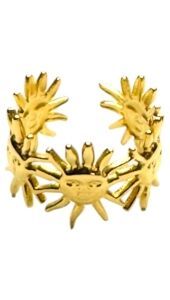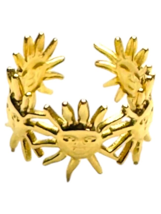Deze verstelbare gouden ring is versierd met een speels en stijlvol patroon van zonnetjes rondom het hele ontwerp. Elke zon straalt warmte en positiviteit uit, waardoor de ring niet alleen een sieraad is, maar ook een symbool van licht en levensvreugde. Draag hem solo of combineer met jouw andere favorieten.