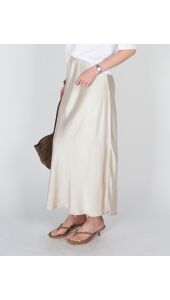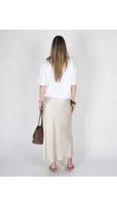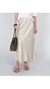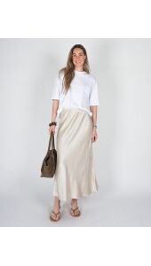 Deze lange satijnen rok in beige heeft een elegante en vrouwelijke uitstraling. De soepele stof valt mooi langs het lichaam en geeft de rok een luxe look. Perfect te combineren met een blouse, knit of top voor een stijlvolle outfit