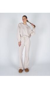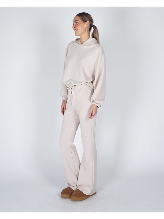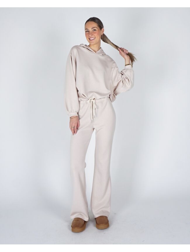 Dit joggingpak wil je élke dag aan. Gemaakt van een luxe scuba stof die mega zacht aanvoelt en prachtig in model blijft. De gepofte trui met capuchon geeft het pak een trendy, vrouwelijke look, terwijl de flared broek zorgt voor een flatterend en mooi silhouet. Perfect om in te loungen, maar net zo geschikt om stylish de deur uit te gaan.