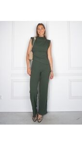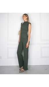Comfy & Chic! De top heeft een hoge hals, korte mouwen, schoudervulling en een schuin afgesneden onderkant. De broek heeft een elastieke tailleband en lange wijde pijpen.