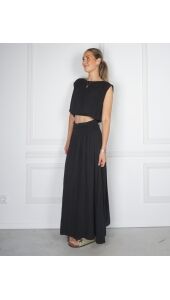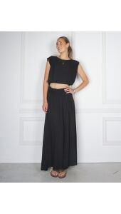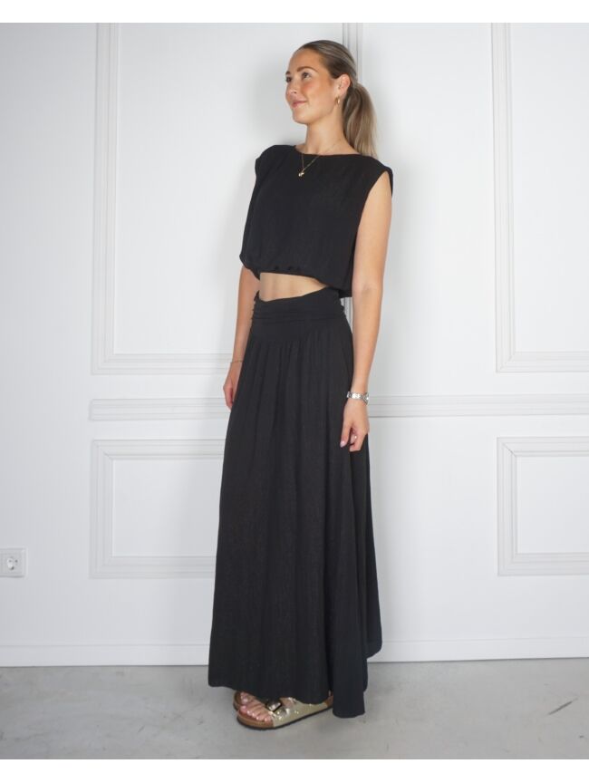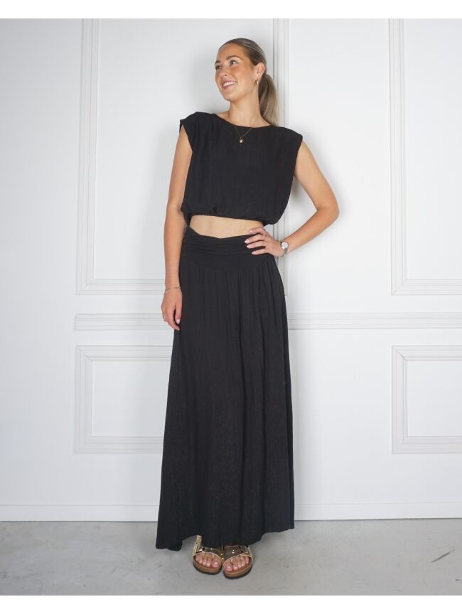 Set ISABELLA is de perfecte zomer set. Gemaakt van 100% viscose, heerlijk luchtig en flowy dus een topper voor het warme weer. De Top heeft elastiek aan de onderkant zodat je 'm op verschillende hoogtes kan dragen. De rok heeft een omgeslagen band die ook high waisted gedragen kan worden.
