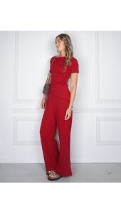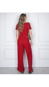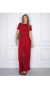Comfy & Chic! De top heeft een hoge hals, korte mouwen en een schuin afgesneden onderkant. De broek heeft een elastieke tailleband en lange wijde pijpen.