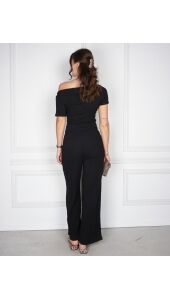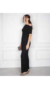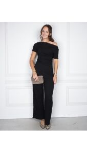 Comfy & Chic! De top heeft een hoge hals, korte mouwen en een schuin afgesneden onderkant. De broek heeft een elastieke tailleband en lange wijde pijpen.