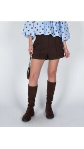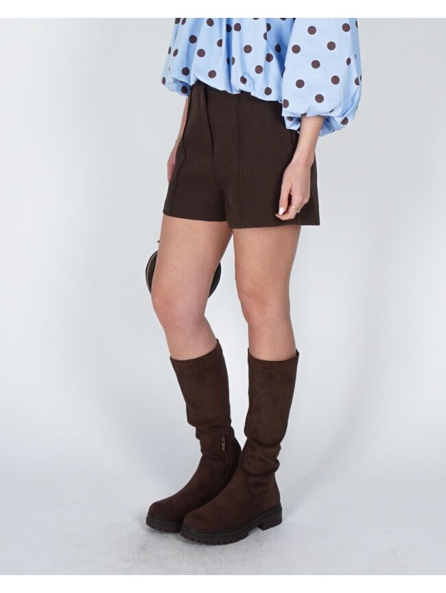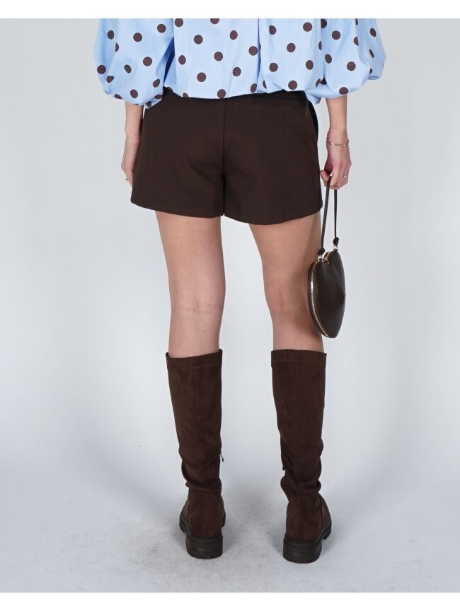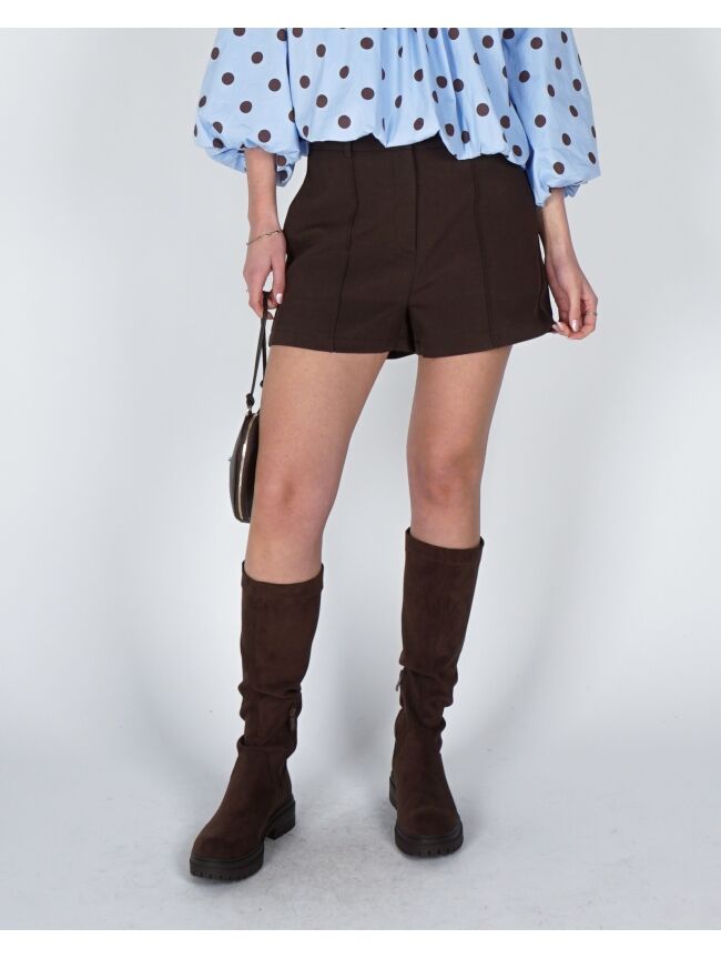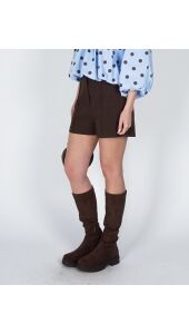 Dit stijlvolle shortje is een perfecte combinatie van chic en comfortabel. De mooie bruine kleur en de strakke, minimalistische afwerking geven het shortje een elegante uitstraling. Dankzij de flatterende pasvorm en stevige stof zit het shortje mooi aangesloten en is het ideaal voor zowel casual als meer geklede outfits.