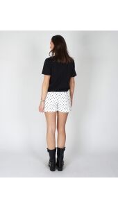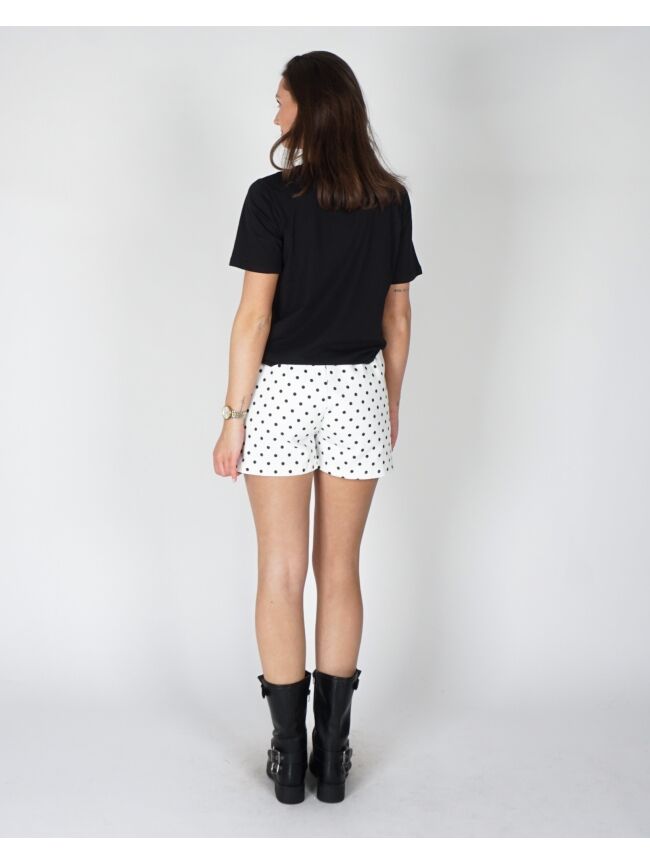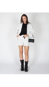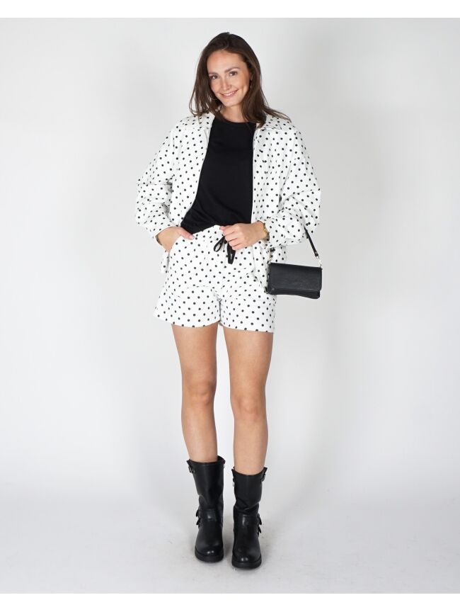 Deze polkadot short is de perfecte combinatie van comfortabel en speels. De elastische tailleband met strik zorgt voor een fijne pasvorm en extra draagcomfort. Ideaal om te combineren met het bijpassende jasje voor een complete en stijlvolle set.