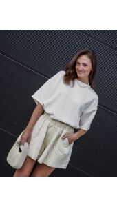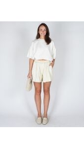 Dit beige denim shortje is perfect voor een effortless summer look. De losse fit en elastische tailleband zorgen voor ultiem comfort, terwijl de subtiele plooitjes een speelse en vrouwelijke uitstraling geven. Of je nu gaat voor casual met een tee of iets meer dressed met een blouse, dit item kan altijd.