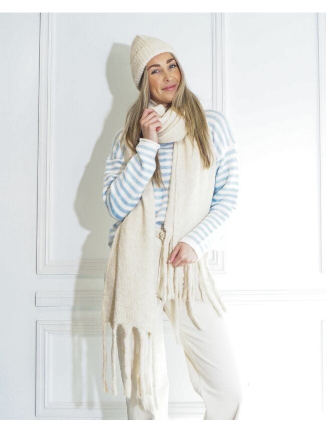 Deze heerlijk zachte sjaal heeft een effen patroon, is gemaakt van dik, hoog kwaliteit materiaal en met lange franjes onderaan. How cute!
