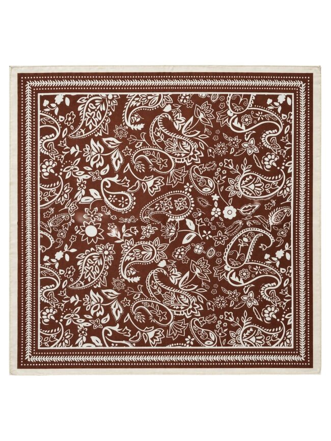 Deze sjaal heeft een klassieke paisley print in warme roestbruine tinten met een stijlvol contrast in wit. Het zachte en soepele materiaal zorgt voor een comfortabele fit en een luxe uitstraling. Perfect om elke outfit een tijdloze en elegante touch te geven.