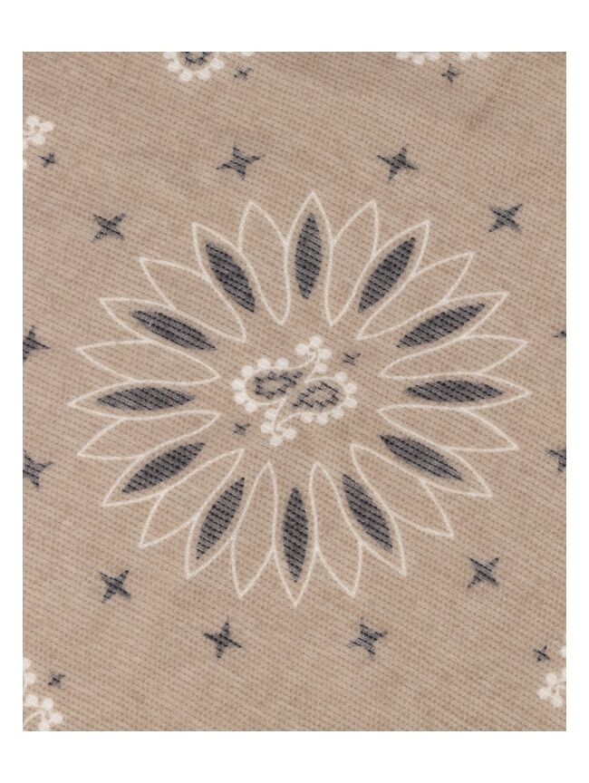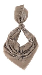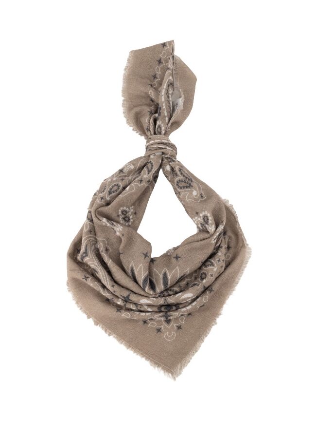 Deze taupe sjaal met bandana-print geeft elke outfit een speelse en trendy touch. Het zachte materiaal en de subtiele rafelrandjes zorgen voor een nonchalante, stoere uitstraling. Draag ’m om je hals, in je haar of aan je tas voor een stijlvolle finishing touch met een vleugje flair.