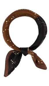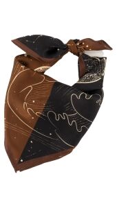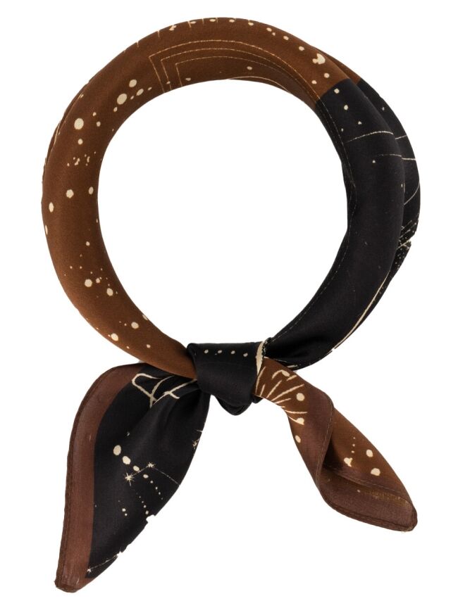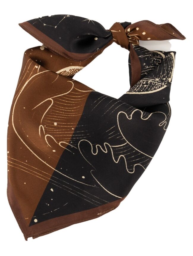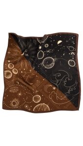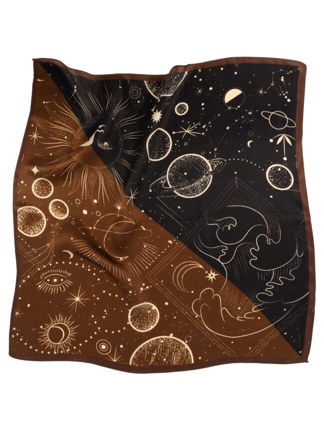 Geef je outfit een unieke en mysterieuze touch met dit stijlvolle sjaaltje met kosmische print. De combinatie van warme bruintinten en diep zwart, verrijkt met fijne illustraties van sterren, planeten en maanfasen, maakt dit item een echte eyecatcher.