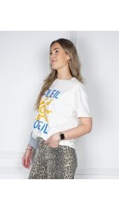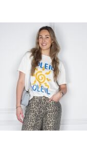 Soleil! Dit t-shirt is de perfecte toevoeging aan jouw spring wardrobe. Draag nu met een lange jeans maar kan ook perfect straks met een van onze rokjes of skortjes! Het shirt heeft een dikkere kwaliteit, schijnt niet door en heeft een gave print.
