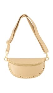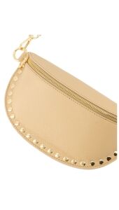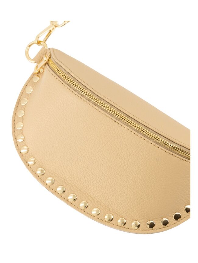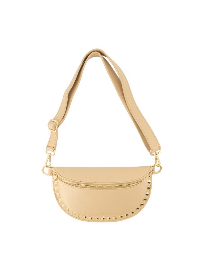 Deze beige tas heeft een tijdloze en stijlvolle uitstraling. De goudkleurige details en studs geven de tas een subtiel, speels accent. Perfect om je outfit compleet te maken, zowel voor dagelijks gebruik als een meer geklede look.