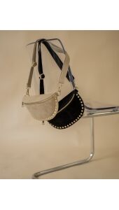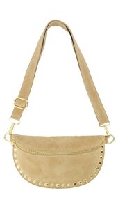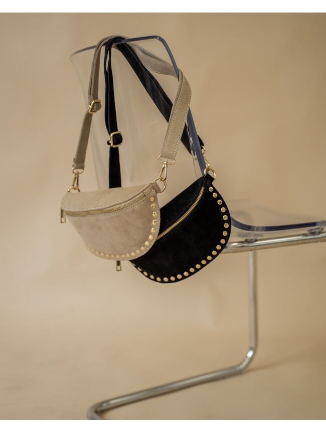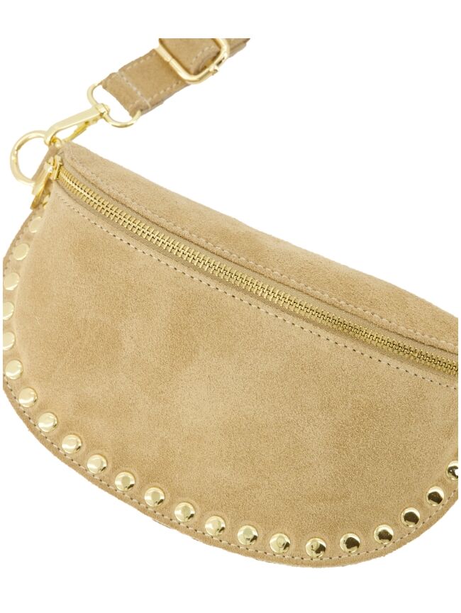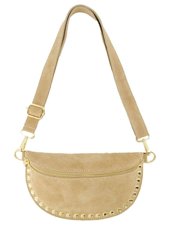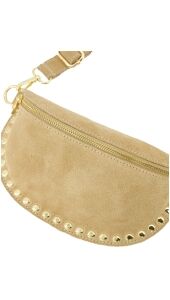 Debby is een suede leren heuptas die ook als crossbody tas gedragen kan worden. De Debby heuptas heeft een binnenvak en een steekvak met een afneembaar en verstelbaar leren hengsel. De tas is afgewerkt met studs en goudkleurig hardware.