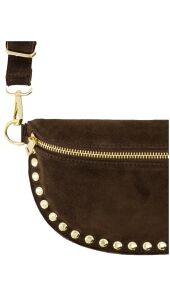 Debby is een suede leren heuptas die ook als crossbody tas gedragen kan worden. De Debby heuptas heeft een binnenvak en een steekvak met een afneembaar en verstelbaar leren hengsel. De tas is afgewerkt met studs en goudkleurig hardware.