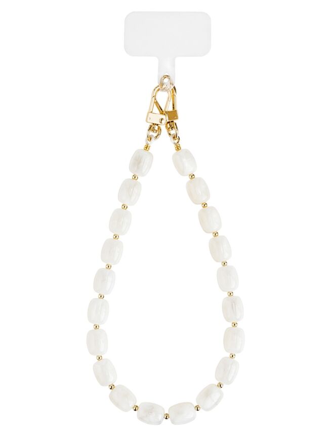 Deze stijlvolle telefoonkoord met ecru kralen geeft jouw telefoon een minimalistische en elegante look. De gouden details en stevige sluiting zorgen voor een luxe uitstraling én praktisch gebruiksgemak. Perfect om je telefoon veilig en fashionable bij je te dragen.