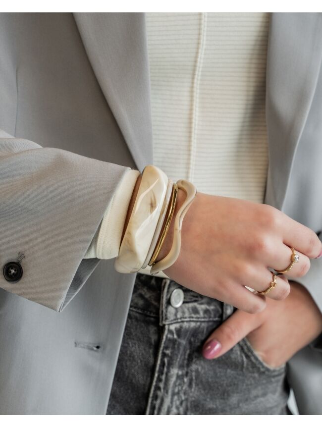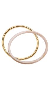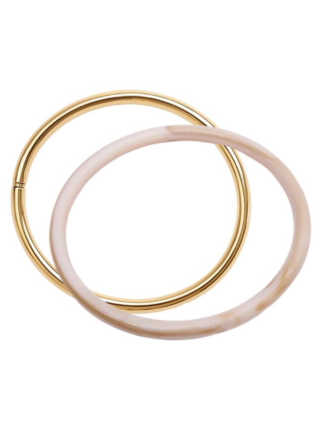 Trendy bangle set in het beige met goud met een stijlvolle, moderne uitstraling. Lichtgewicht, elegant en perfect om elke outfit een frisse en chique touch te geven.
