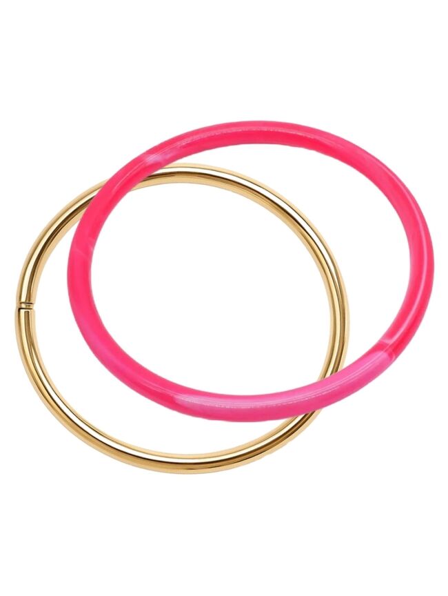 Trendy bangle set in het fuchsia met goud met een stijlvolle, moderne uitstraling. Lichtgewicht, elegant en perfect om elke outfit een frisse en chique touch te geven.
