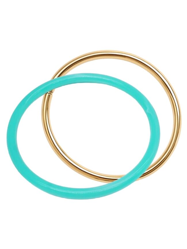 Trendy bangle set in het turquoise met goud met een stijlvolle, moderne uitstraling. Lichtgewicht, elegant en perfect om elke outfit een frisse en chique touch te geven.