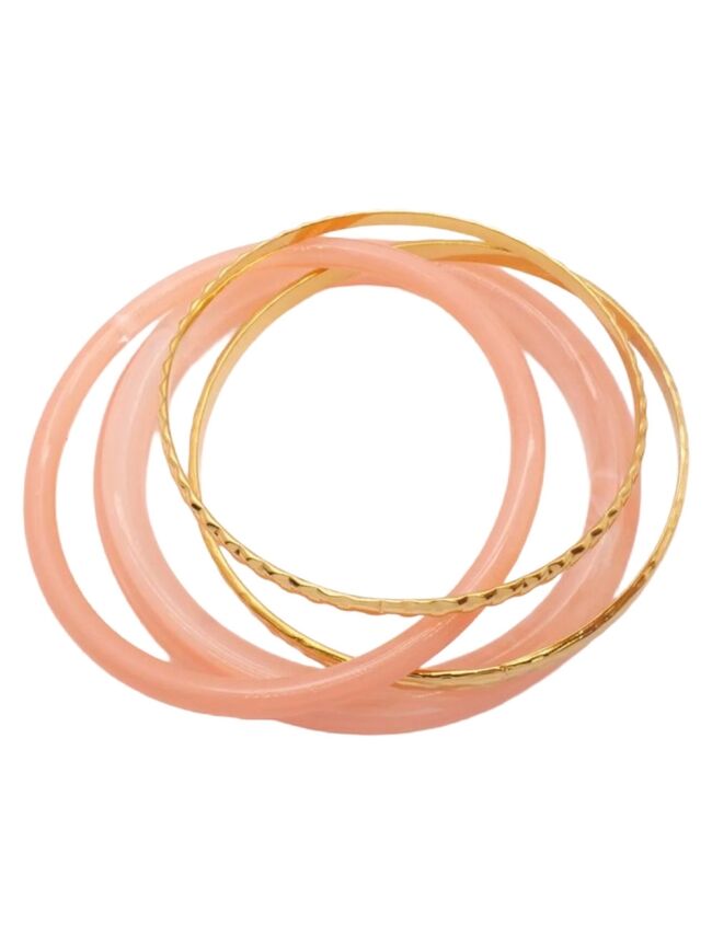 Trendy bangle set met lichtroze en gouden bangles. Lichtgewicht, stijlvol en perfect om elke outfit een frisse en elegante touch te geven.