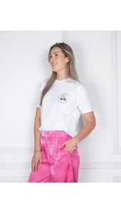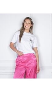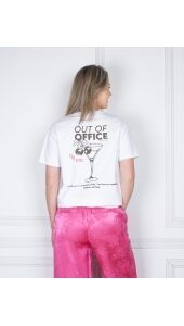 Dit witte T-shirt met roze & bruine print is allesbehalve saai! Op de voorkant staan kersjes & op de achterkant staat een mega leuke print van een Martini glas met 'out of office'. Door de loose fit kun je ‘m op verschillende manieren dragen: cropped voor een speelse touch of los voor een relaxte vibe. Combineer met een skort voor een zomerse look of met een wide leg broek voor een all-day, everyday outfit.
