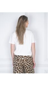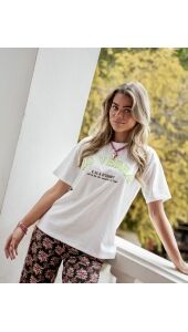 Dit off white T-shirt is basic, maar allesbehalve saai! De stijlvolle lime-kleurige Es Vedra print op de voorkant maakt deze tee net even anders. Door de loose fit kun je ‘m op verschillende manieren dragen: cropped voor een speelse touch of los voor een relaxte vibe. Combineer met een skort voor een zomerse look of met een wide leg broek voor een all-day, everyday outfit.