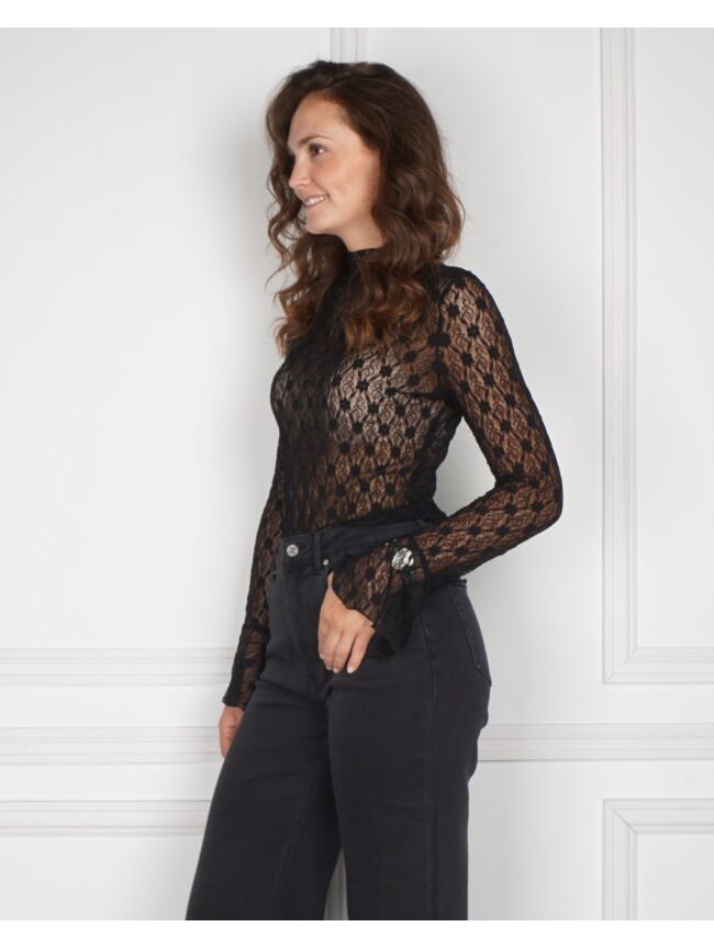 Deze kanten top met trompet mouw is een echte must-have! Gemaakt van nylon en spandex, voelt hij zacht en stretchy aan voor een comfy fit. Het verfijnde kantdesign voegt net dat beetje extra elegance toe aan je outfit. Perfect om te stylen met een mooie blazer of gewoon casual met je favoriete jeans.