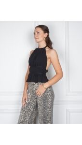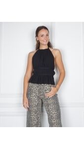 Deze Ruffle Halter Top in zwart geeft je look instant edge met zijn speelse ruches en flatterende haltersnit. In het zwart is hij extra chic. De achterkant is echt prachtig! Style met je favoriete jeans of denim short en you're runway ready.