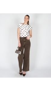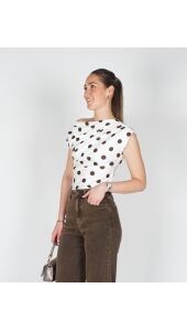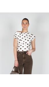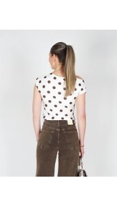 Deze polka dot top in wit met bruine stippen heeft een speelse en vrouwelijke uitstraling. De korte mouwen maken de top luchtig en comfortabel om te dragen. Perfect te combineren met een jeans voor een vrolijke look.