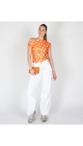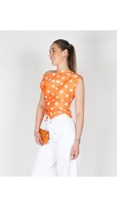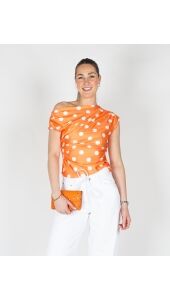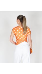 Deze polka dot top in oranje met witte stippen heeft een speelse en vrouwelijke uitstraling. De korte mouwen maken de top luchtig en comfortabel om te dragen. Perfect te combineren met een jeans voor een vrolijke look.
