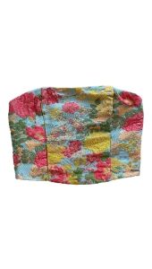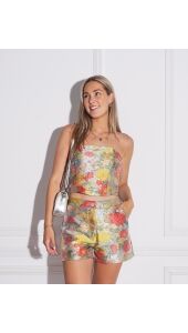 Deze prachtige bandeautop met koraal, blauwe en beige bloemenprint is een must-have voor de zomer. Perfect om te stylen met de bijpassende short voor een trendy co-ord look. Comfortabel, stijlvol en ideaal voor zonnige dagen!