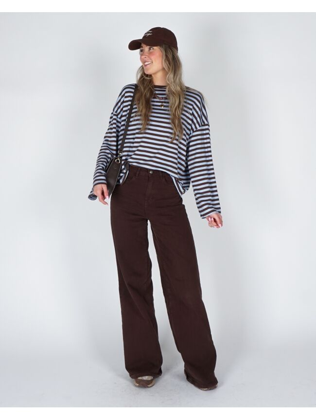 Deze bruin-blauw gestreepte longsleeve is de perfecte mix van basic en trendy. De zachte stof en relaxte fit maken ’m ideaal voor everyday wear met een stijlvolle twist. Draag ’m op een jeans of onder een jasje voor een hippe look.