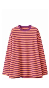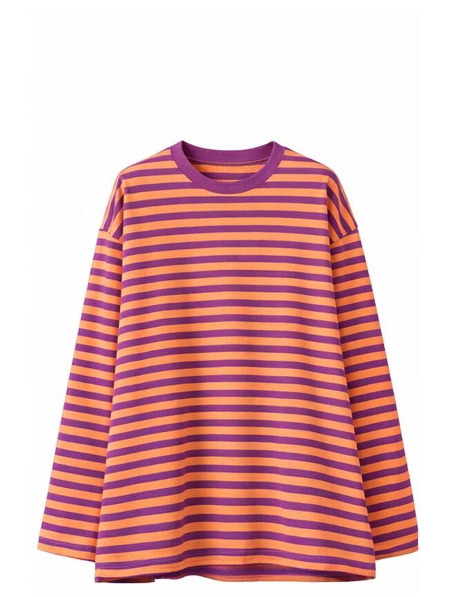 De Gestreepte Longsleeve Kim in paars/oranje heeft een oversized fit, is gemaakt van 100% katoen en is verkrijgbaar in verschillende kleurencombinaties – comfortabel, trendy en makkelijk te combineren.