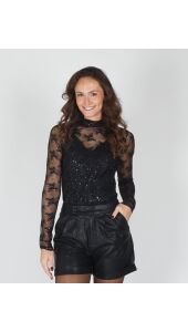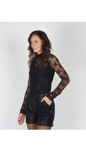 Laat jezelf stralen in deze glamoureuze mesh top met strass steentjes! De transparante stof en fonkelende details maken dit de perfecte party top voor een avondje uit of festival. Combineer met een bralette of leren broek voor een trendy, opvallende look.