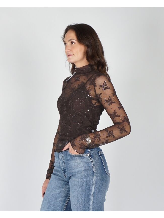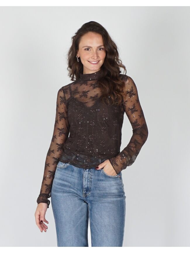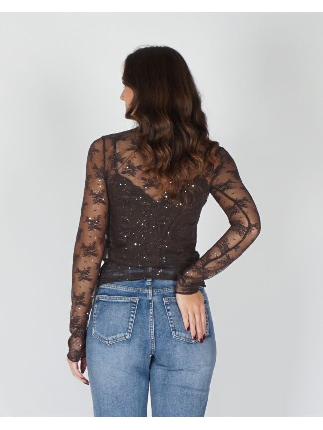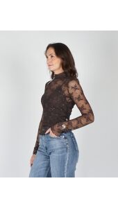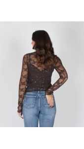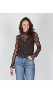 Laat jezelf stralen in deze glamoureuze mesh top met strass steentjes! De transparante stof en fonkelende details maken dit de perfecte party top voor een avondje uit of festival. Combineer met een bralette of leren broek voor een trendy, opvallende look.