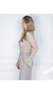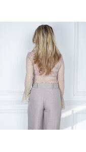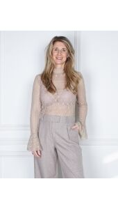 Deze transparante kanten top is een statement piece dat moeiteloos elegantie uitstraalt. De fijne kant met subtiele patronen creëert een luchtige, sensuele look, terwijl het opstaand kraagje een sophisticated touch toevoegt. De trompetmouwen geven de top een speelse, vloeiende beweging en maken elke outfit net dat beetje specialer.
