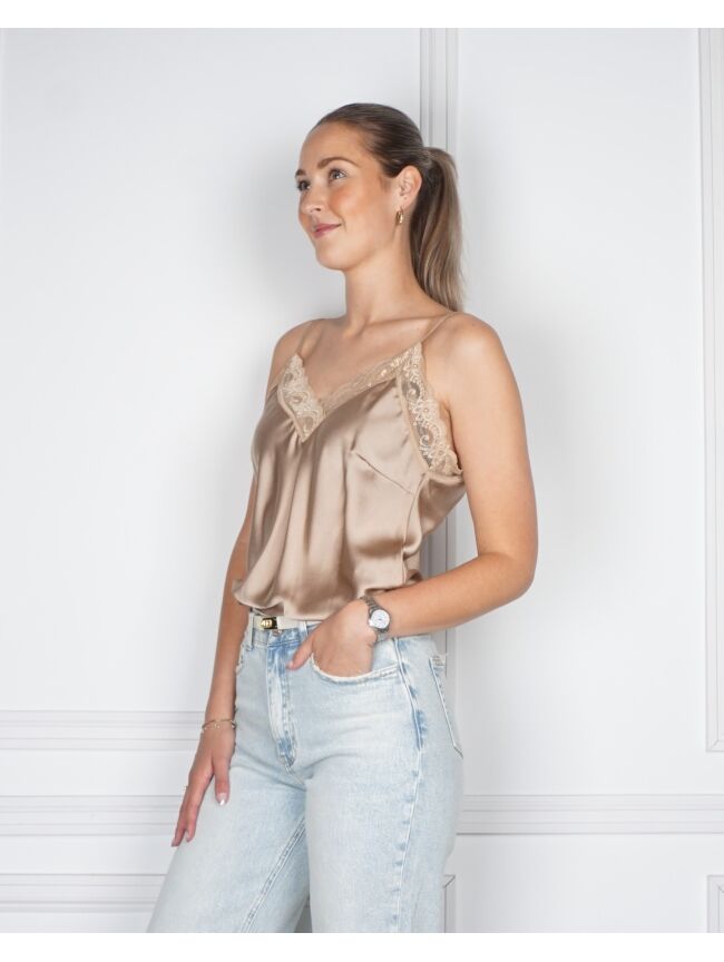 Deze sierlijke top is een fijne basic om in je garderobe te hebben. De bandjes zijn verstelbaar & het kant geeft de top net even iets extra's. Draag onder een jurkje of juist onder een blazer voor een casual look.