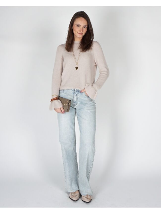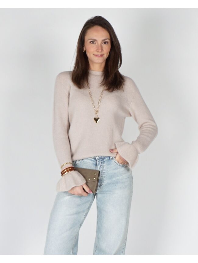 Deze stijlvolle is een echte must-have voor een tijdloze en vrouwelijke look. De zachte, fijngebreide stof voelt comfortabel aan op de huid en zorgt voor een elegante uitstraling. De subtiele flare mouwen geven de trui een speelse en verfijnde touch, terwijl de ronde hals en ribgebreide boorden zorgen voor een mooie, aansluitende fit. Perfect om te combineren met een nette pantalon voor een classy outfit of draag ‘m casual op een jeans voor een effortless everyday look.