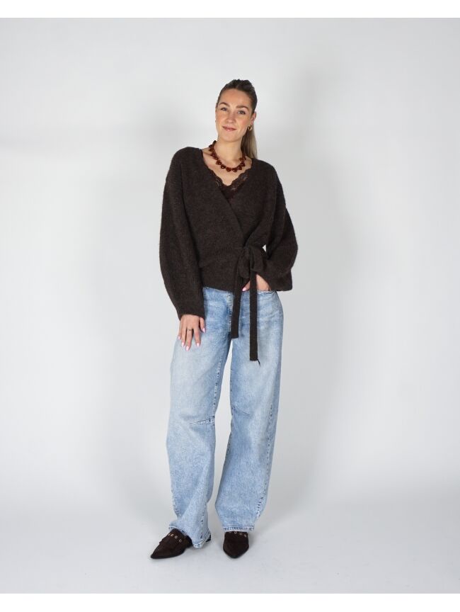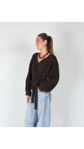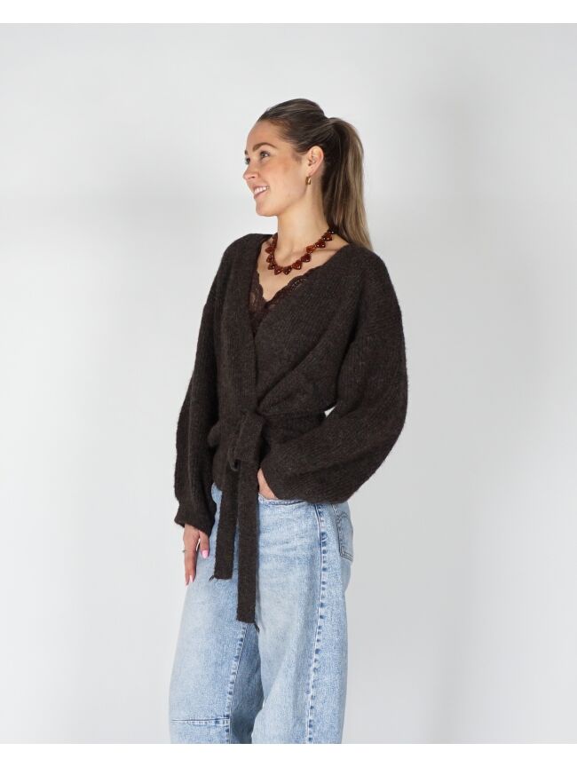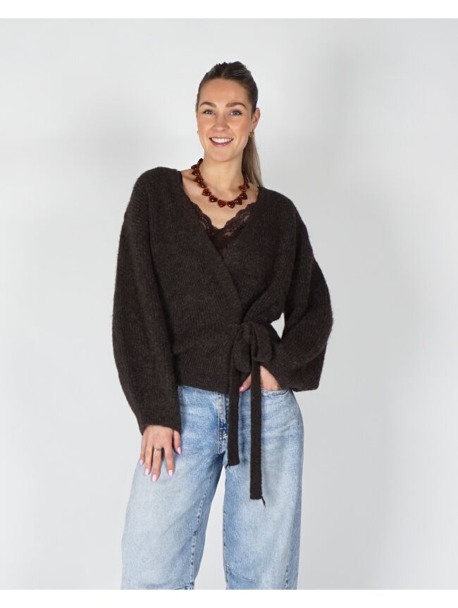 Dit gebreide wikkelvest in bruin is een echte must-have voor dit seizoen. Het vest heeft een zachte structuur en draagt comfortabel. Makkelijk te combineren over een top of blouse voor elke dag.