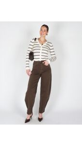 Dit ecru vestje met dunne bruine strepen heeft een tijdloze en stijlvolle uitstraling. De V-hals en knoopjes aan de voorkant geven het vest een klassiek detail. Perfect te combineren met een jeans of pantalon voor een comfortabele en elegante look.