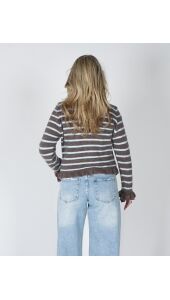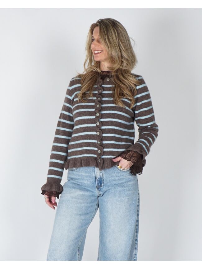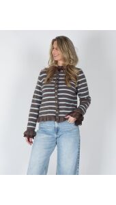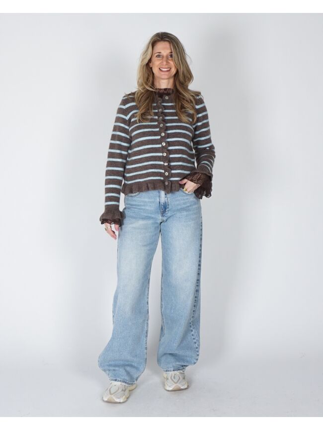 Dit bruin-blauw gestreepte vestje met ruffle details is een echte must-have. De kleurcombinatie geeft een warme, maar frisse uitstraling en draagt heerlijk comfortabel. Perfect om te combineren met een jeans of als extra laagje over je outfit