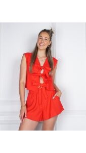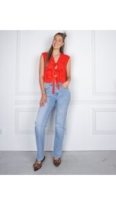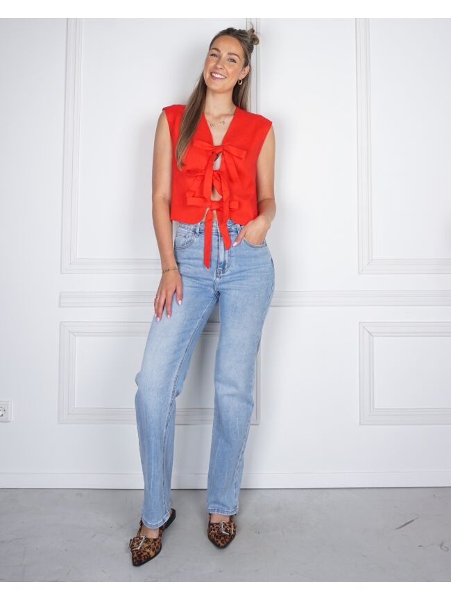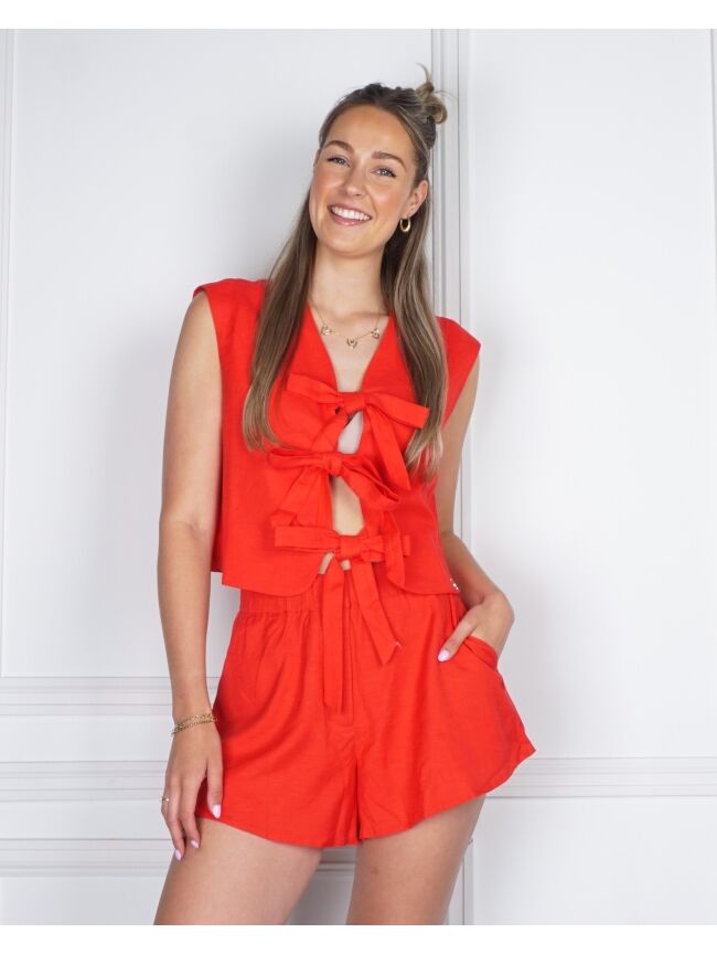 Bring on the summer vibes! Het SELBY gilet in BITTERSWEET RED is jouw nieuwe statement piece. Met drie speelse striksluitingen aan de voorkant en een mouwloos silhouet is dit gilet zowel elegant als edgy. De luchtige stof en het open design maken het perfect voor warme dagen. Combineer m met de bijpassende LACY short voor een co-ord look die je deze zomer overal wilt dragen. Complete your outfit with this eye-catcher and youre ready to go!