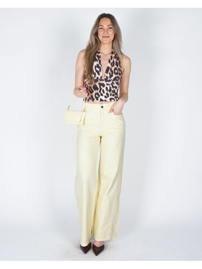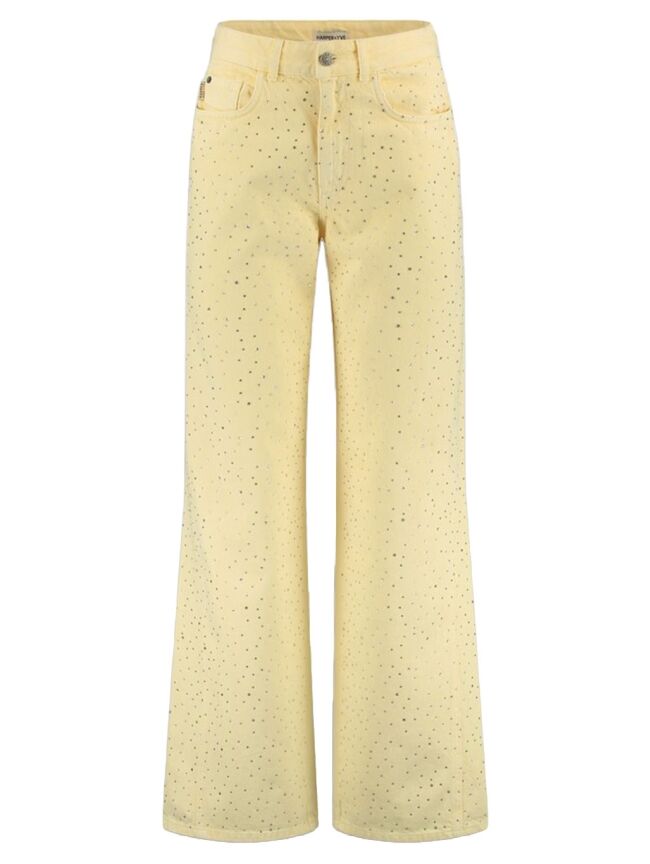 De Mayra jeans in lichtgeel is een echte eyecatcher dankzij de subtiele all-over steentjes. De wide leg pasvorm en hoge taille zorgen voor een flatterend en comfortabel silhouet. Perfect te combineren met een basic top voor een frisse en stijlvolle look.